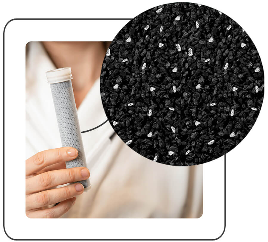 Activated carbon is a form of carbon that has been treated to increase its porosity and surface area, making it extremely absorbent. It is often used in water filtration to remove contaminants such as heavy metals, PFAS, pesticides, and chlorine by binding them to its surface through a process called adsorption. This makes activated carbon effective at improving water quality.